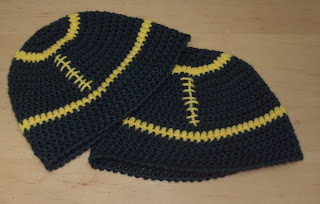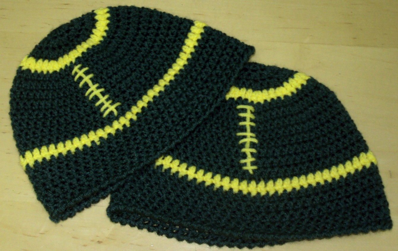 Ok... There we go. Now, DS requested green and yellow footballs, specifying "yellow laces". So, that is what I did. The fact that I now own a "pounder" ball of yellow worsted weight acrylic that I don't have a clue what I'm going to do with (Ok, so it isn't a full ball anymore, it is missing a few yards....) means that I guess I'm acquiring a "stash".