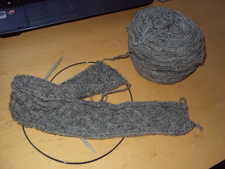 I know, not easy to see, but there is a repeat cable pattern, and the strip is supposed to go over the front of your head from collar bone to collar bone - using a tape measure, I need one more partial repeats - which is why I back-burnered it. Didn't want to reknit on different needles, wasn't sure how to proceed, etc. So, finally, while prepping for this year's attempts to clear up projects, I just went ahead and put the strip over my head... I am going to do one more full repeat of the pattern.