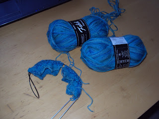 Next, the other January sock - from a featured designer. I can't remember the name of the designer, dang it, but the socks are Hermione's Everyday Socks. I've finished the 1X1 rib cuff of the first sock. This is the one I'm doing on the Lantern Moon needles, one of which broke - the glue seems to be holding, though...and this yarn is also more turquoisey than the picture.