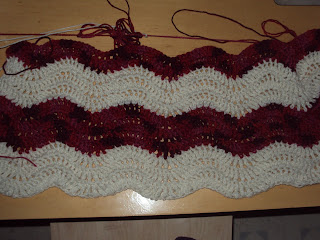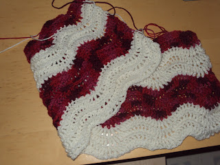 I'm further along with this afghan/lapghan. I found a great colourway of yarn one day, and fell in love with it. I thought it would come out better if it were crocheted instead of knitted, and there were only three balls of it on the shelf. So, I bought them (Red Heart Comfort in "Lipstick" - brighter than this picture shows, really) and I bought an equal amount of the off white. I'm using a larger than recommended hook to further "soften" the appearance of the scallops. Didn't want a sharp ripple. I kind of like this pattern - simple, easy to remember, good mindless work for watching TV. :) I am not totally positive which is the "right side" -